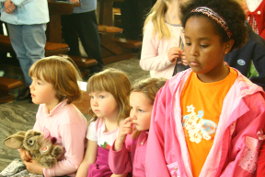 mit ihren Eltern, Großeltern oder Freunden. Die Kinderkirche dauert